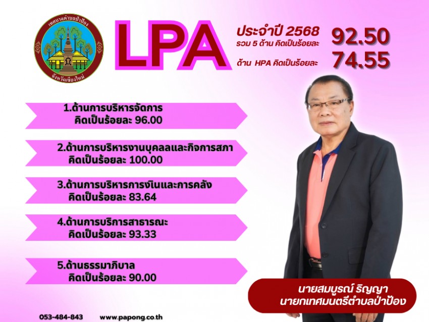 - ประกาศเทศบาลตำบลป่าป้อง เรื่อง ผลการประเมินประเมินประสิทธิภาพขององค์กรปกครองส่วนท้องถิ่น LPA 2568(22 ส.ค. 68)