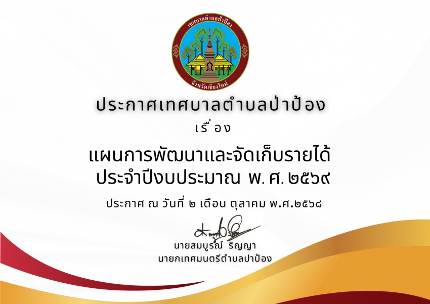 | 1 | แผนการพัฒนาและจัดเก็บรายได้ ประจำปีงบประมาณ พ.ศ.๒๕๖๙ | 1.05 MB. | 9 |