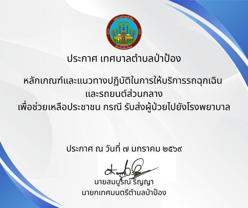 ประกาศเรื่องหลักเกณฑ์และแนวทางปฏิบัติในการให้บริการรถฉุกเฉิน และรถยนต์ส่วนกลาง เพื่อช่วยเหลือประชาชน กรณี รับส่งผู้ป่วยไปยังโรงพยาบาล