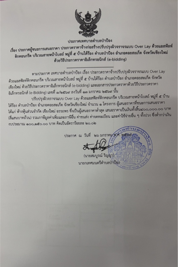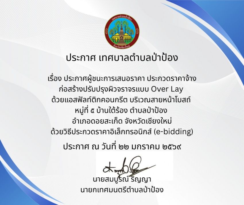 ???? ประกาศเทศบาลตำบลป่าป้อง: ผลผู้ชนะการประกวดราคา