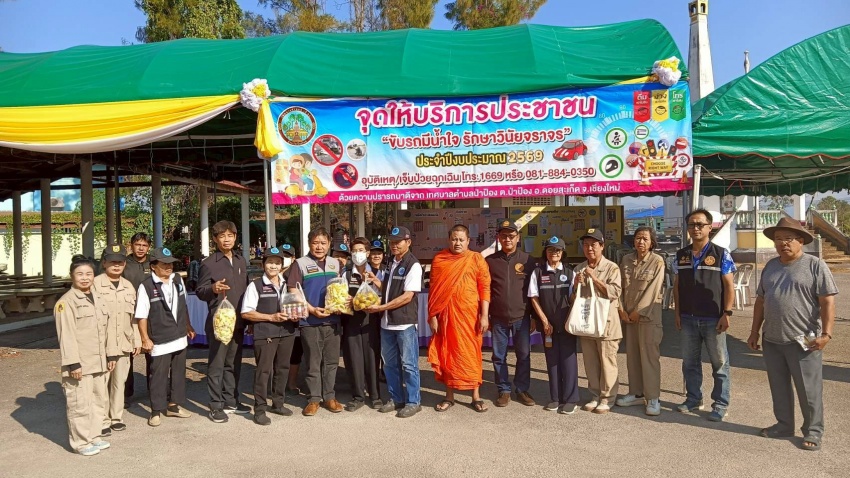 พระครูปลัดสุนทรธรรมวัฒน์ เจ้าอาวาส วัดชยาลังกา (ป่าป้อง) เมตตามอบอาหารว่างและเครื่องดื่ม เพื่อเป็นขวัญและกำลังใจให้กับเจ้าหน้าที่ที่ปฏิบัติงาน ณ ศูนย์อำนวยการความปลอดภัยทางถนน (7 วันอันตราย)