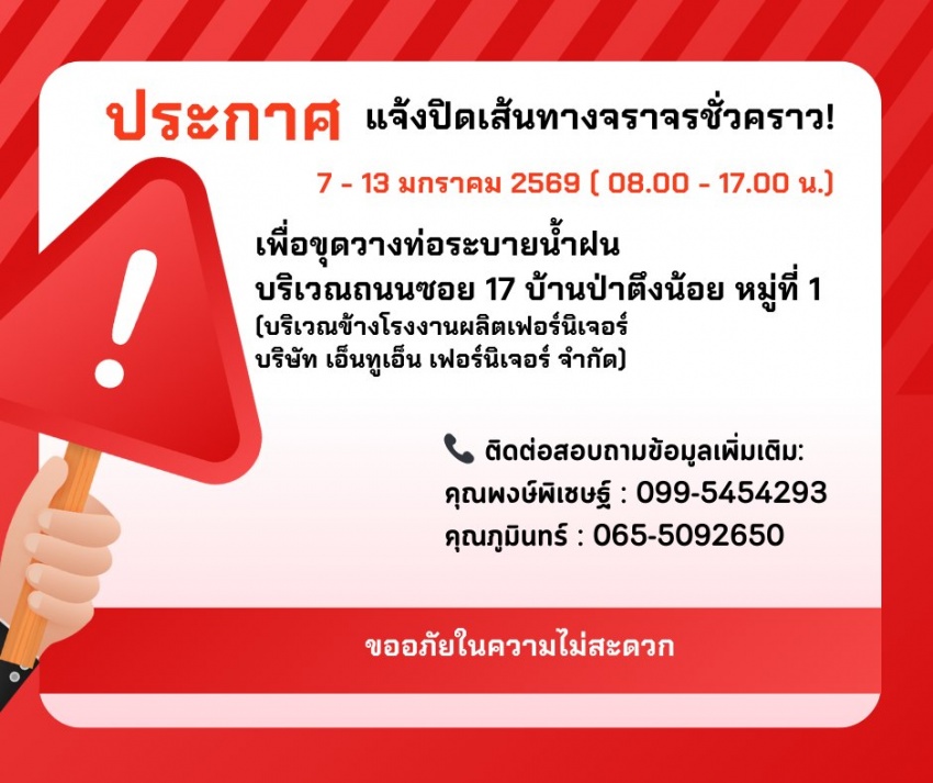 ???? ประกาศแจ้งปิดเส้นทางจราจรชั่วคราว! ????