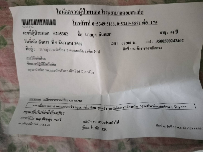 หมอนัดเปลี่ยนสายฉี่วันที่ 9 ธันวาคม 2568 โรงพยาบาลดอยสะเก็ดเวลา 9:00 น