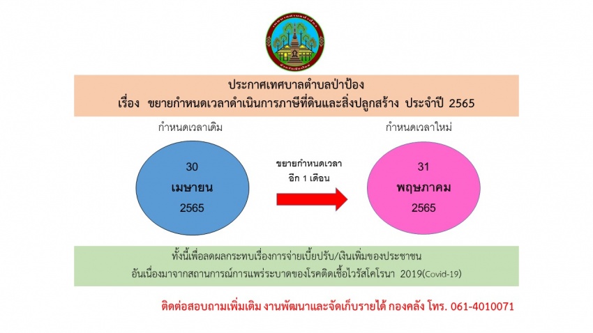 ประกาศเทศบาลตำบลป่าป้อง เรื่อง การขยายกำหนดเวลาการดำเนินการภาษีที่ดินและสิ่งปลูกสร้าง ประจำปี 2565