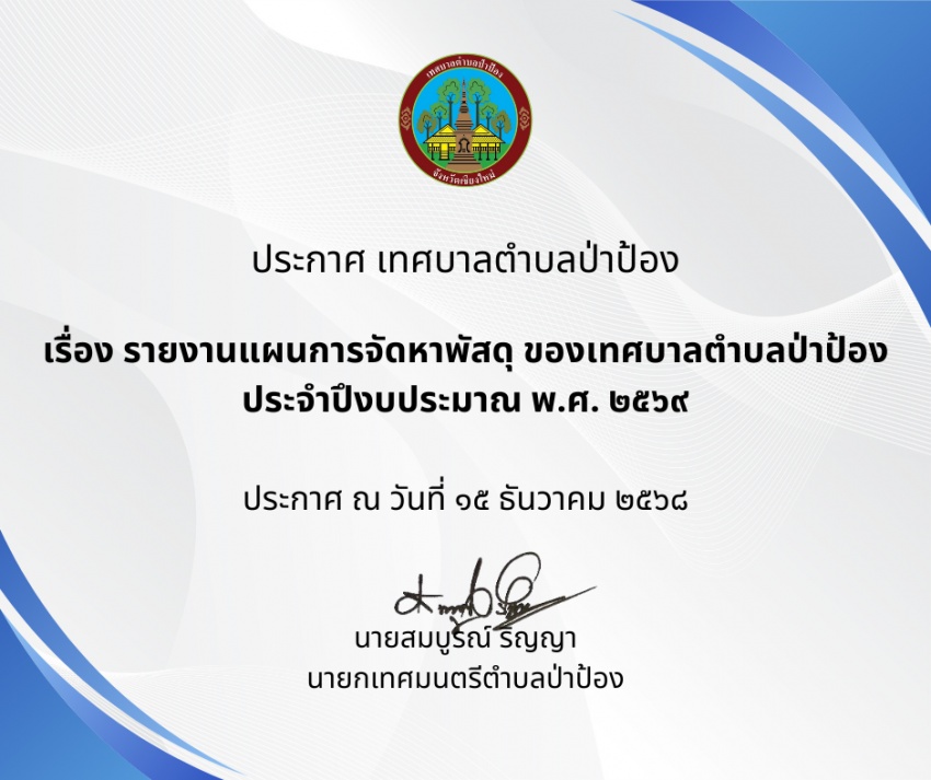 ประกาศ เทศบาลตำบลป่าป้อง เรื่อง เรื่อง รายงานแผนการจัดหาพัสดุ ของเทศบาลตำบลป่าป้อง ประจำปึงบประมาณ พ.ศ. ๒๕๖๙