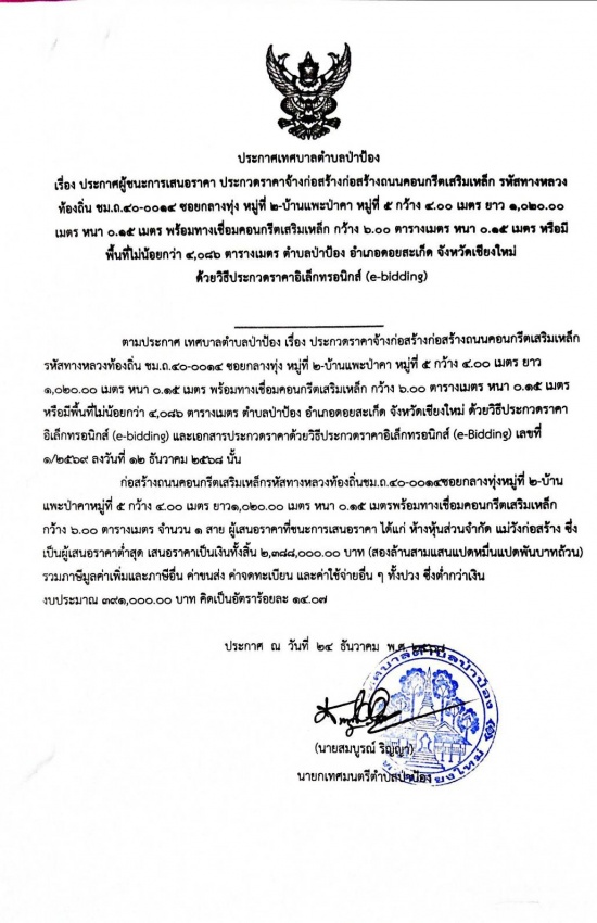 ประกาศเทศบาลตำบลป่าป้อง เรื่อง ประกาศผู้ชนะการเสนอราคา ประกวดราคาจ้างก่อสร้างก่อสร้างถนนคอนกรีตเสริมเหล็ก รหัสทางหลวง ท้องถิ่น ชม.ถ.๔๐-๐๐๑๔ ซอยกลางทุ่ง หมู่ที่ ๒-บ้านแพะบำคา หมู่ที่ ๕ ๕ กว้าง ๔.๐๐ เมตร ยาว ๑,๐๒๐.๐๐ เมตร หนา ๐.๑๕ เมตร พร้อมทางเชื่อมคอนกรีตเสริมเหล็ก กว้าง ๖.๐๐ ตารางเมตร หนา ๐.๐๕ เมตร