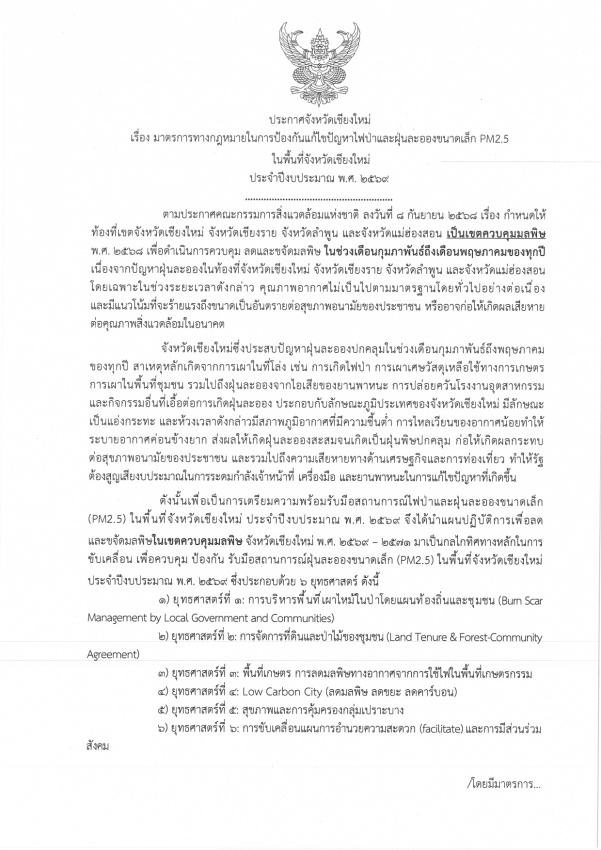 ประกาศจังหวัดเชียงใหม่ เรื่อง มาตรการทางกฎหมายในการป้องกันแก้ไขปัญหาไฟป่าและ ฝุ่นละอองขนาดเล็ก PM2.5 ในพื้นที่จังหวัดเชียงใหม่ ประจำปีงบประมาณ พ.ศ. 2569