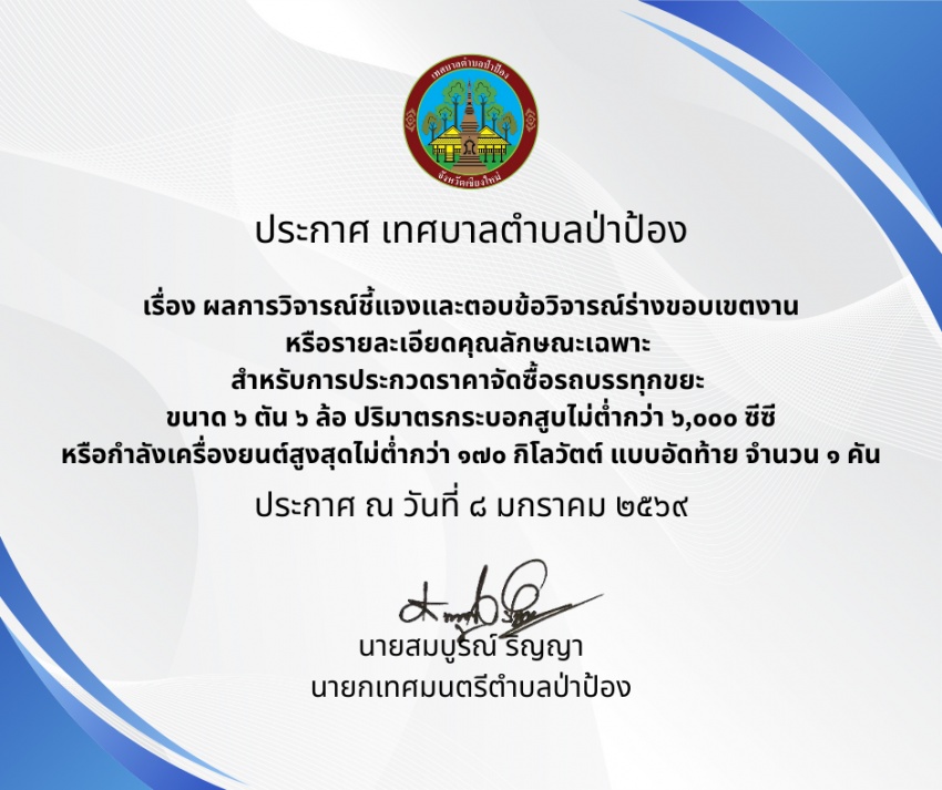ประกาศ เรื่อง ผลการวิจารณ์ชี้แจงและตอบข้อวิจารณ์ร่างขอบเขตงาน หรือรายละเอียดคุณลักษณะเฉพาะ สำหรับการประกวดราคาจัดซื้อรถบรรทุกขยะ ขนาด ๖ ตัน ๖ ล้อ ปริมาตรกระบอกสูบไม่ต่ำกว่า ๖,๐๐๐ ซีซี หรือกำลังเครื่องยนต์สูงสุดไม่ต่ำกว่า ๑๗๐ กิโลวัตต์ แบบอัดท้าย จำนวน ๑ คัน