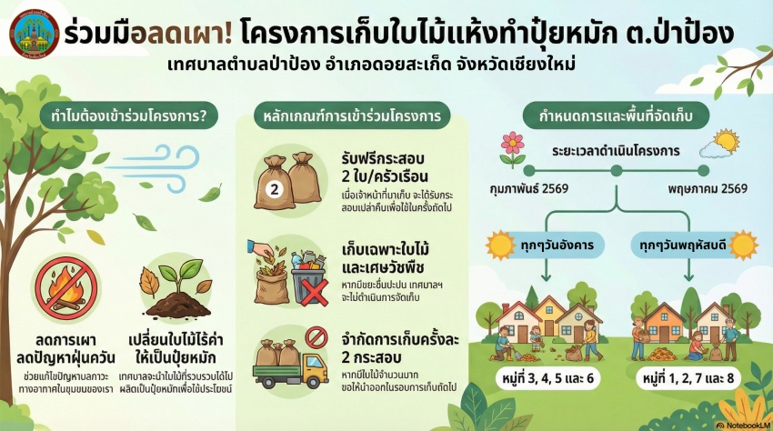 ชาวป่าป้องร่วมใจ ลดเผา ลดฝุ่น กับโครงการ "หมู่บ้านสะอาด" ปี 2569 เทศบาลตำบลป่าป้องเชิญชวนพ่อแม่พี่น้องทุกครัวเรือน มาร่วมกันเปลี่ยนใบไม้แห้งให้เป็นปุ๋ยหมัก เพื่อลดปัญหาการเผาและมลพิษในชุมชนของเรากัน
