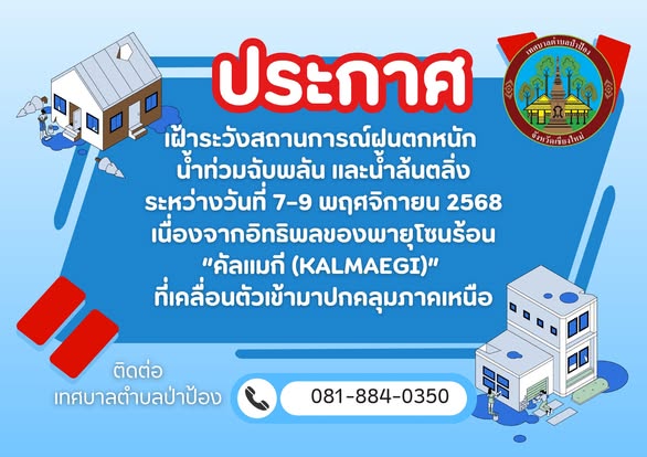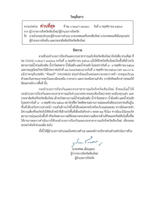 จังหวัดเชียงใหม่แจ้งเตือนให้ทุกอำเภอและองค์กรปกครองส่วนท้องถิ่นเฝ้าระวังสถานการณ์ฝนตกหนัก น้ำท่วมฉับพลัน และน้ำล้นตลิ่ง ระหว่างวันที่ 7?9 พฤศจิกายน 2568 เนื่องจากอิทธิพลของพายุโซนร้อน ?คัลแมกี (KALMAEGI)? ที่เคลื่อนตัวเข้ามาปกคลุมภาคเหนือ