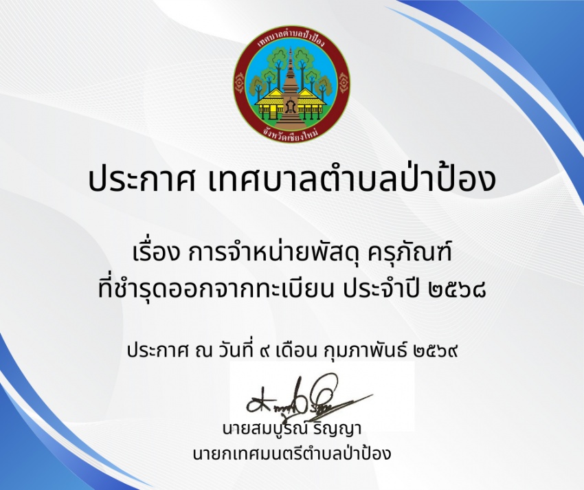 ประกาศเทศบาลตำบลป่าป้อง เรื่องการจำหน่ายพัสดุ ครุภัณฑ์ ที่ชำรุดออกจากทะเบียน ประจำปี ๒๕๖๘