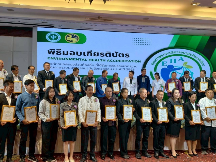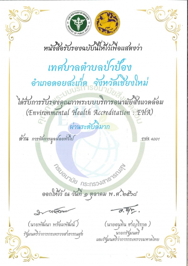 เทศบาลตำบลป่าป้อง รับมอบเกียรติบัตรรับรองคุณภาพระบบบริการอนามัยสิ่งแวดล้อม (EHA) ประจำปี 2568 ด้านการจัดการมูลฝอยทั่วไป 4001 ผ่านระดับ ดีมาก