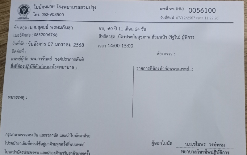 ขอความอนุเคาระห์รถส่งผู้ป่วยจิตเวช น.ส สุคนธ์ พรหมกันธา ไปรพ สวนปรุง เวลา 13.00 น. ซึ่งไปตามใบนัดดังกล่าว จึงขออนุเคราะรถ 4 ประตู ไปส่ง